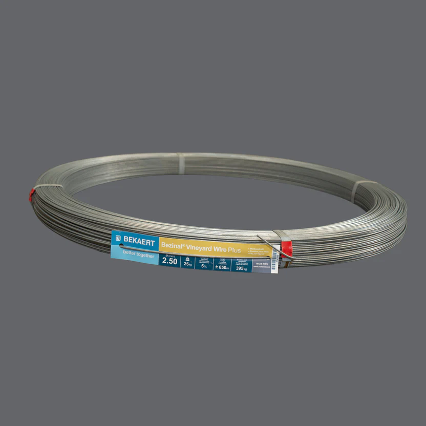 +/- 650m 25kg roll Bezinal® Plus 5% elongation 395kg breaking load Tensile strength N/mm2 700/900 Other wire gauges and specifications are available on request - please get in touch. The fruiting wire provides integral support for the whole trellising system. Fruiting wire secures to the end posts with a Gripple Medium to allow easy tensioning. The tension should be taut, but not to the point of creating stress on the posts or risking snapping if accidentally clipped by machinery. Bekaert’s patented Bezinal® wire is specifically manufactured for the vineyard sector and extends the lifetime of your